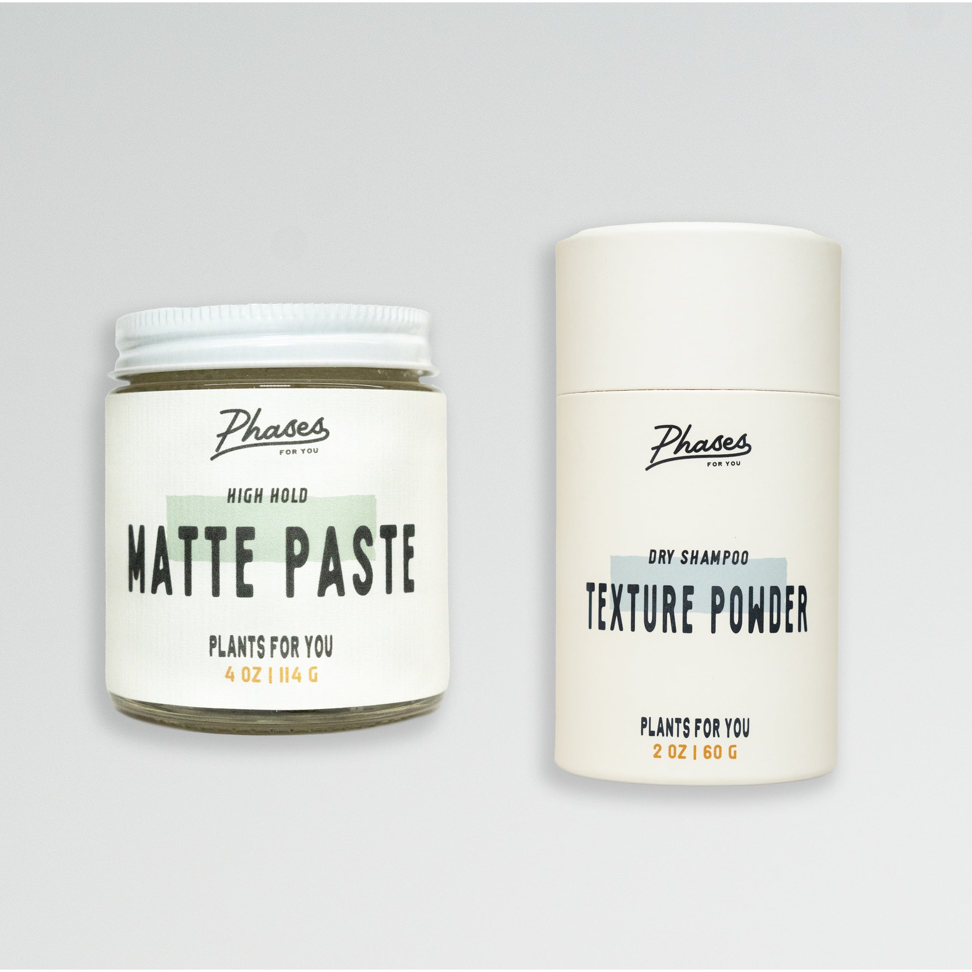 Get effortless volume and touchable hold with this power pair. Our Texture Powder adds lightweight lift and grit at the roots, while Matte Paste gives definition and control without the shine.